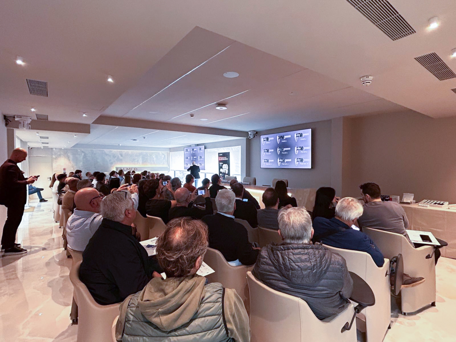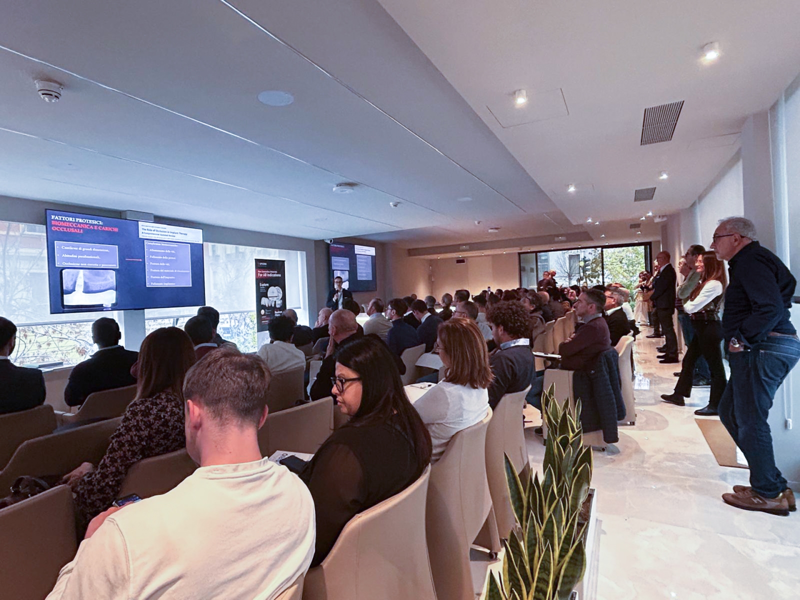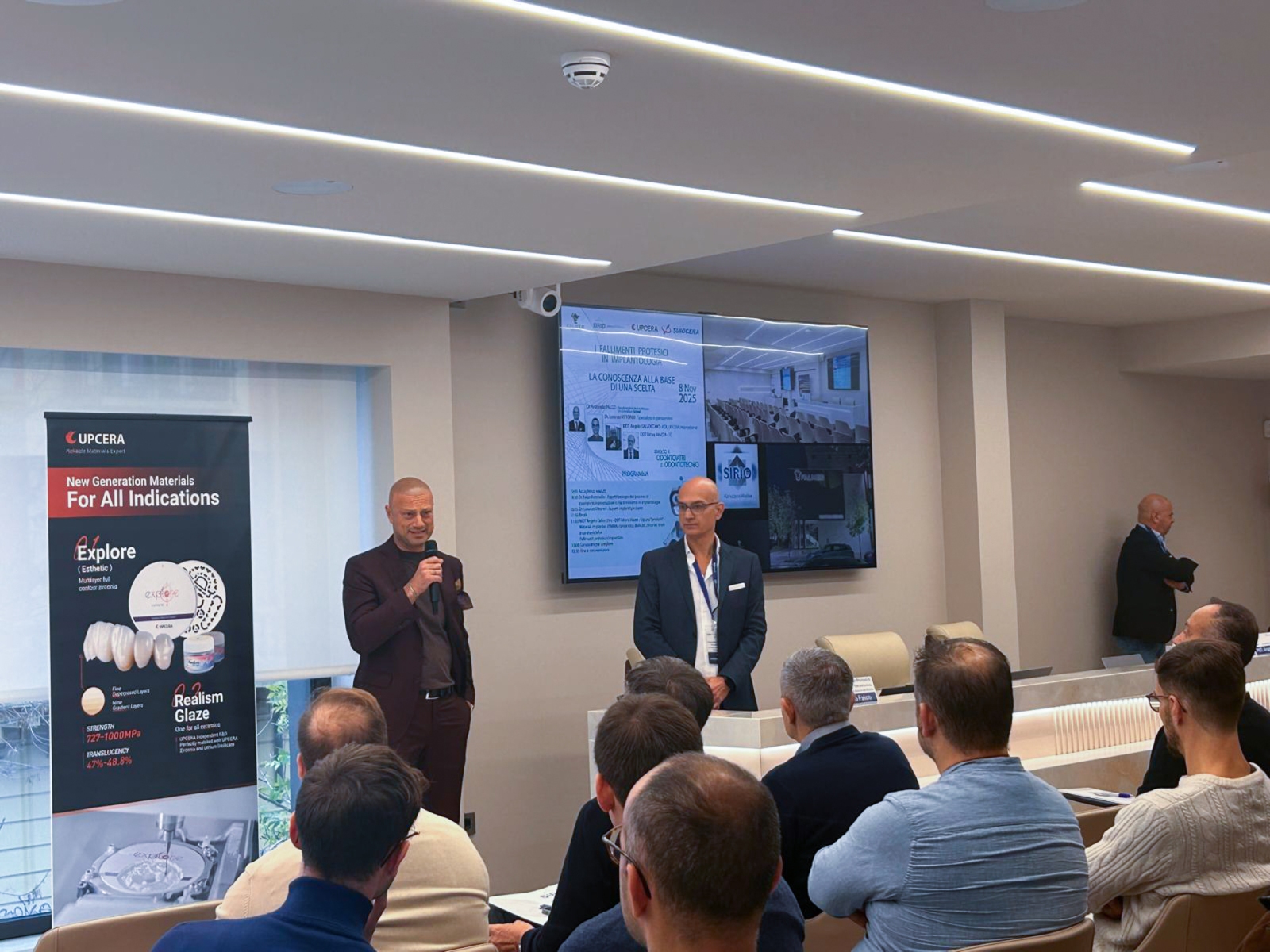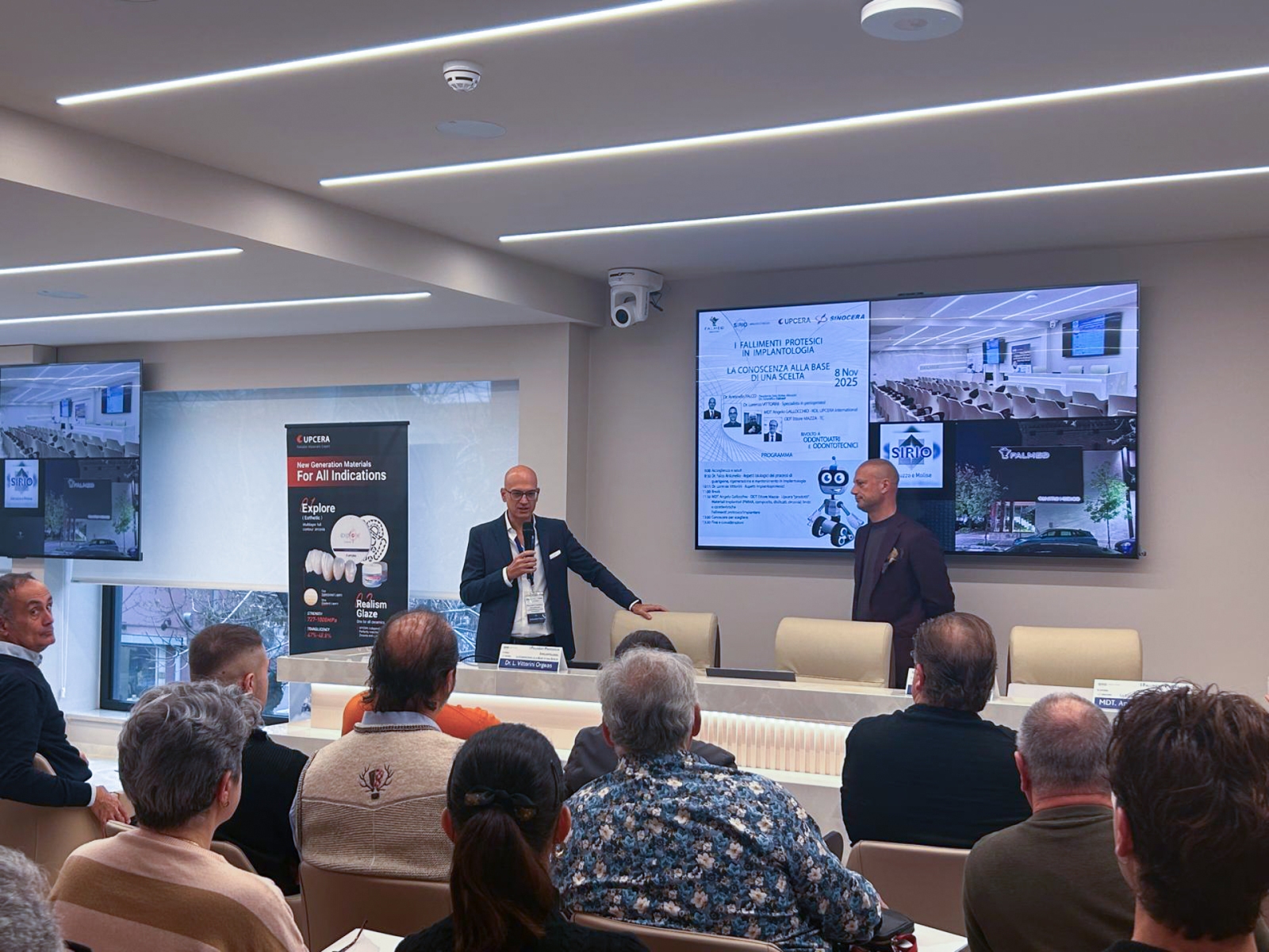 Dopo il break, la sessione è proseguita con gli interventi di MDT Angelo Gallocchio, Key Opinion Leader UPCERA International, e ODT Ettore Mazza (TC), che hanno illustrato i materiali implantari – dal PMMA alla zirconia – mettendo in luce limiti, caratteristiche e implicazioni cliniche legate ai diversi approcci e alle cause di fallimento protesico o implantare.